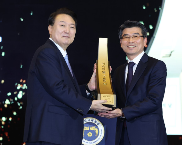 윤석열 대통령이 제60회 무역의날 기념식에서 장재훈 현대차 대표이사에게 300억불 수출의 탑을 친수한 뒤 기념촬영을 하고 있다. ⓒ 연합뉴스