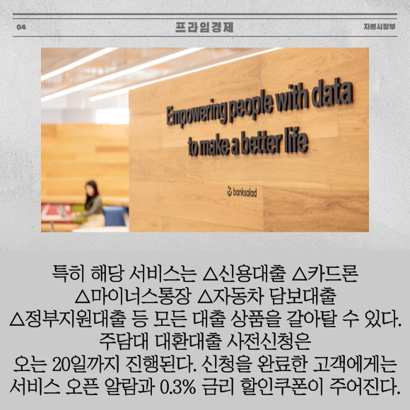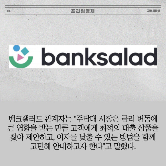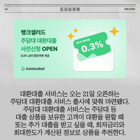[프라임경제] 뱅크샐러드는 주택담보대출(이하 주담대)을 포함해 모든 대출 상품을 갈아탈 수 있는 대출 갈아타기 사전신청을 시작한다고 5일 밝혔다.