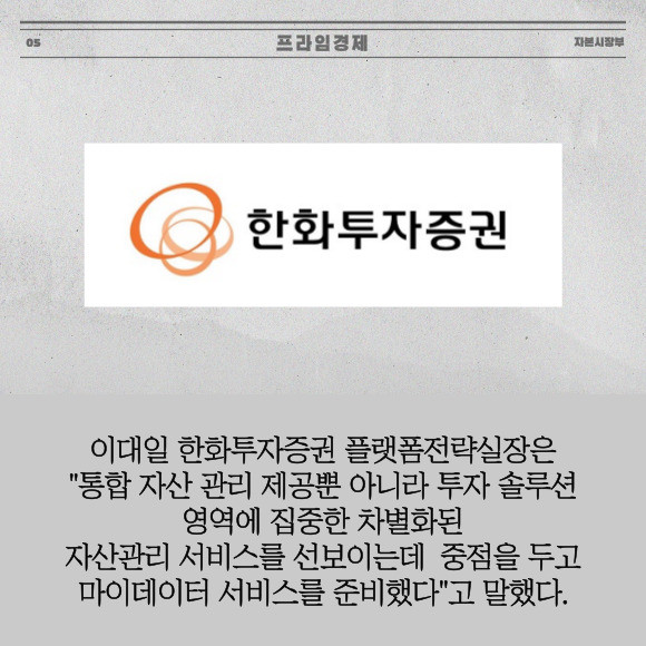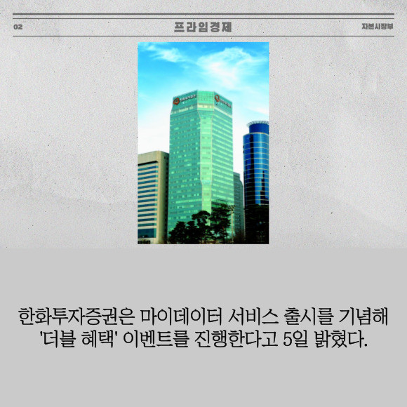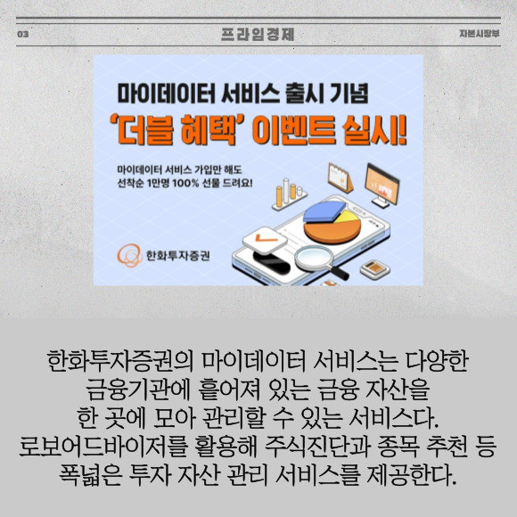 [프라임경제] 한화투자증권(003530)은 마이데이터 서비스 출시를 기념해 '더블 혜택' 이벤트를 진행한다고 5일 밝혔다.