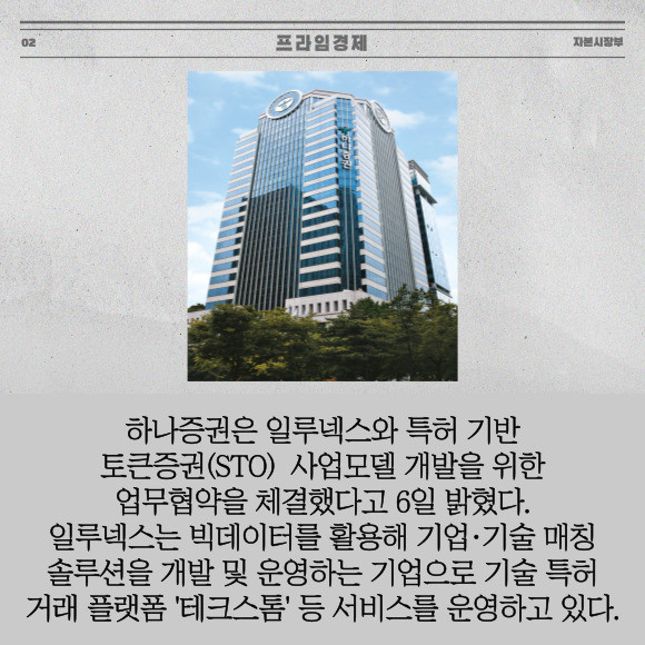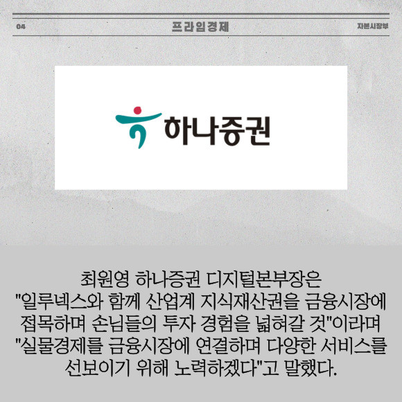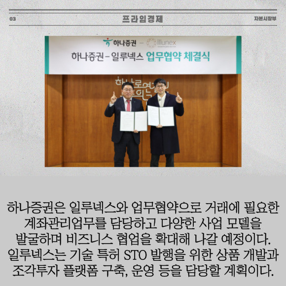 [프라임경제] 하나증권은 일루넥스와 특허 기반 토큰증권(STO) 사업모델 개발을 위한 업무협약을 체결했다고 6일 밝혔다.