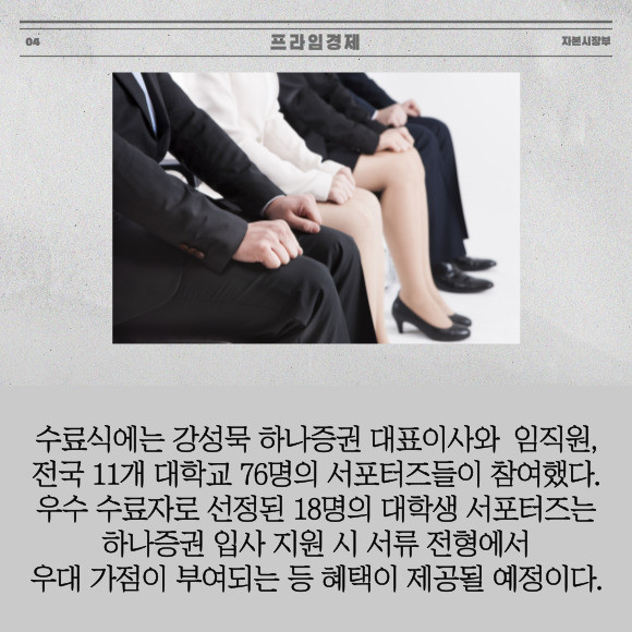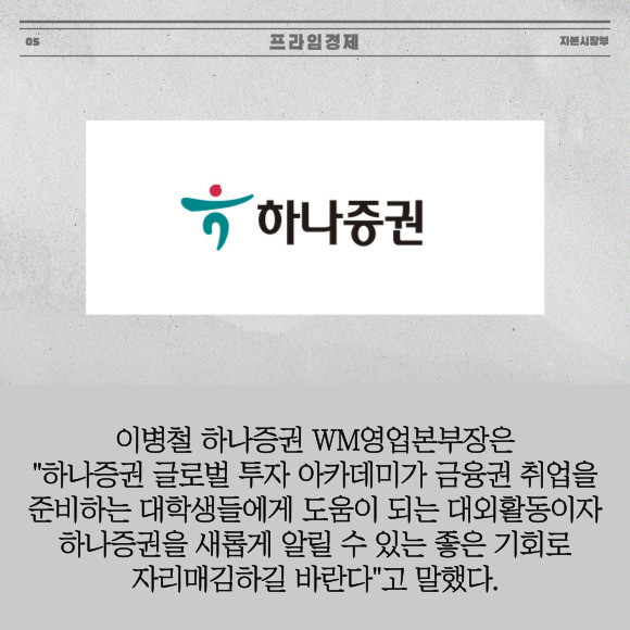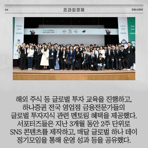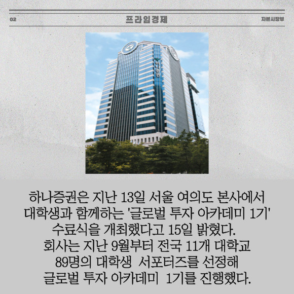 [프라임경제] 하나증권은 지난 13일 서울 여의도 본사에서 대학생과 함께하는 '글로벌 투자 아카데미 1기' 수료식을 개최했다고 15일 밝혔다. 회사는 지난 9월부터 전국 11개 대학교 89명의 대학생 서포터즈를 선정해 글로벌 투자 아카데미 1기를 진행했다.