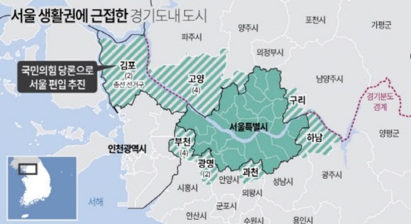 국힘에서 출발한 '메가서울 프로젝트'에 서울과 인접한 도시들이 잇따라 관심을 내비치며 상황이 급변하고 있다. 업계에 따르면 김포시 외에도 여권에서 언급하는 편입 가능성이 있는 지자체는 △구리 △고양 △하남 △광명 △과천 △부천 등도 거론되면서 엄청난 파장이 예고되고 있다.