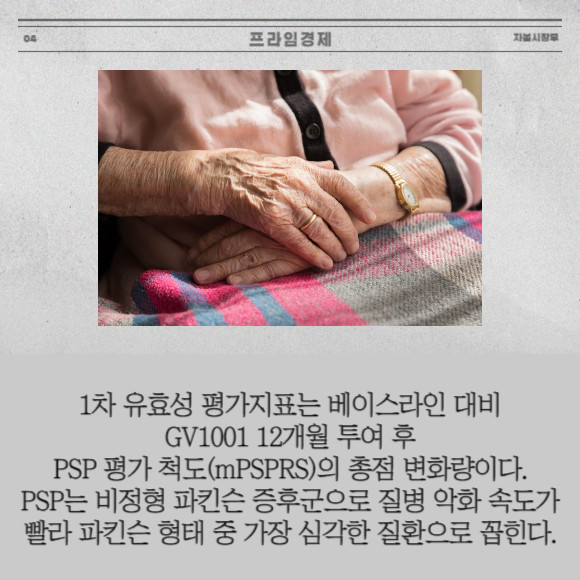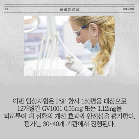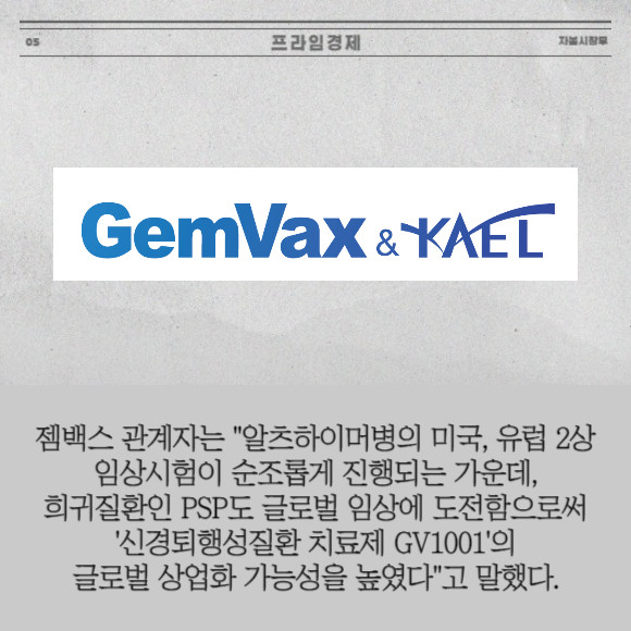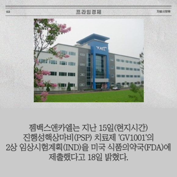 [프라임경제] 젬백스앤카엘(082270)는 지난 15일(현지시간) 진행성핵상마비(PSP) 치료제 'GV1001'의 2상 임상시험계획(IND)을 미국 식품의약국(FDA)에 제출했다고 18일 밝혔다.