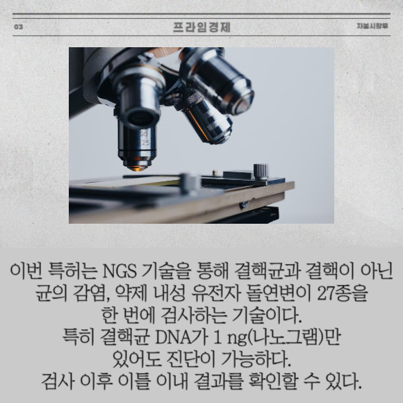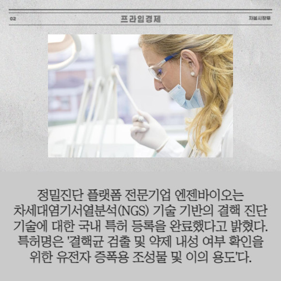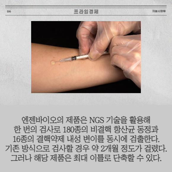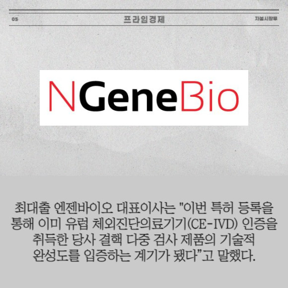 [프라임경제] 정밀진단 플랫폼 전문기업 엔젠바이오(354200)는 차세대염기서열분석(NGS) 기술 기반의 결핵 진단 기술에 대한 국내 특허 등록을 완료했다고 20일 밝혔다. 특허명은 '결핵균 검출 및 약제 내성 여부 확인을 위한 유전자 증폭용 조성물 및 이의 용도'다.
