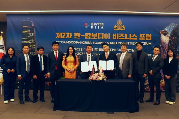 김영문 한국청년기업가협회 회장(사진 중앙 오른쪽)은 21일 한국무역협회(KITA)가 주한 캄보디아 대사관과 공동으로 개최한 '제2차 한-캄보디아 비즈니스 포럼'에 참석해 킴 수어 레이 캄보디아 청년기업가협회 회장(사진 중앙 왼쪽)과 양국간 경제 교류 활성화를 위한 업무협약에 서명했다. © 푸드나무