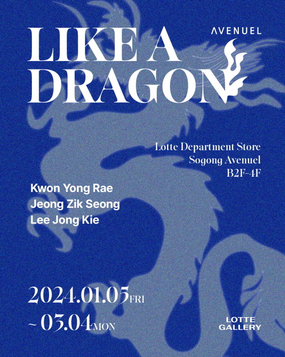 롯데백화점은 롯데갤러리와 함께 오는 1월5일부터 3월4일까지 본점 에비뉴엘 지하 2층부터 4층 아트월을 통해 권용래, 정직성, 이종기 작가가 참여한 <Like a Dragon>展을 진행한다.