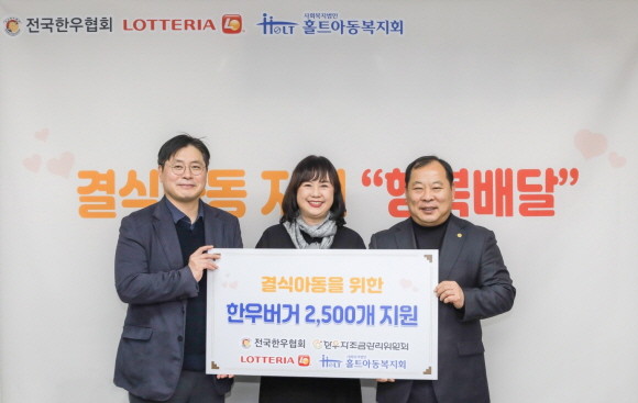 추운 겨울 결식 아동들에게 따듯한 온정을 전달하고자 진행한 이번 햄버거 기부 전달식에는 이원택 롯데GRS 상무, 손윤실 홀트아동복지회 본부장, 김삼주 전국한우협회 회장이 참석했다.
