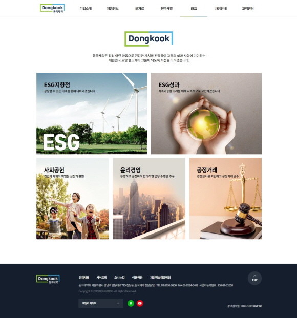 동국제약은 지난해 ESG 성과 등 콘텐츠를 업그레이드한 홈페이지를 오픈하고, 인사돌플러스 사랑봉사단 등을 통한 사회공헌활동을 지속적으로 펼쳤다.