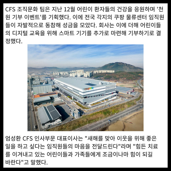 [프라임경제] 쿠팡풀필먼트서비스(이하 CFS)는 작년에 이어 올해도 어린이 환자들을 돕기 위한 임직원 성금을 서울대학교어린이병원과 통합케어센터 어린이병원학교에 기부했다고 9일 밝혔다.