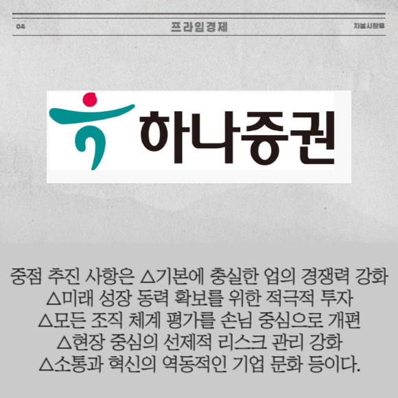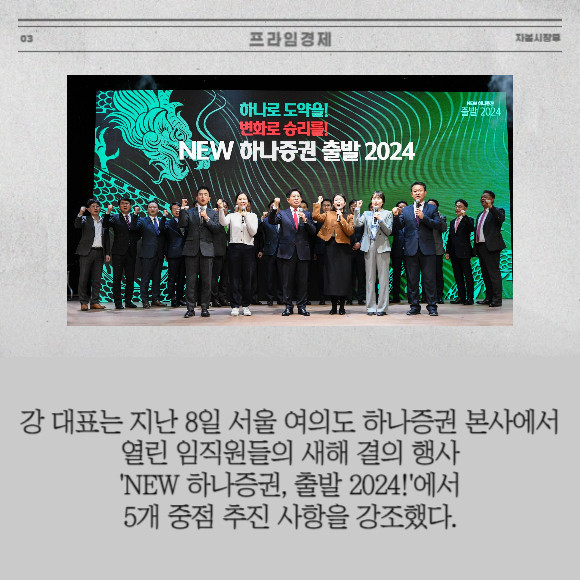 [프라임경제] 강성묵 하나증권 대표가 임직원들에게 "올해 업의 경쟁력 강화를 통한 턴어라운드를 이루겠다"고 10일 밝혔다.