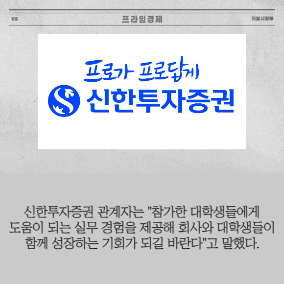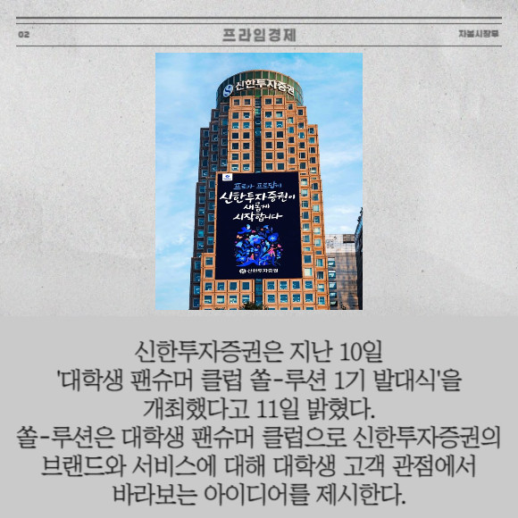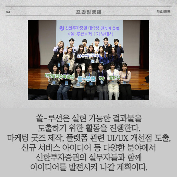 [프라임경제] 신한투자증권은 지난 10일 '대학생 팬슈머 클럽 쏠-루션 1기 발대식'을 개최했다고 11일 밝혔다. 쏠-루션은 대학생 팬슈머 클럽으로 신한투자증권의 브랜드와 서비스에 대해 대학생 고객 관점에서 바라보는 아이디어를 제시한다.