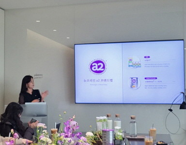 유한건강생활 브랜드 뉴오리진은 11일 오전 유한건강생활 본사 라운지에서 a2 제품 설명회를 진행했다. 이날 설명회는 a2브랜드 및 a2우유를 소개하는 자리로 마련됐다. = 추민선 기자