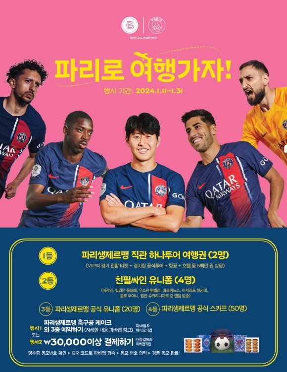 파리바게뜨가 '파리 생제르맹'의 경기를 현지에서 직접 관람할 수 있는 VIP 관람 투어 티켓과 선수들의 친필 싸인 유니폼 등을 증정하는 이벤트를 진행한다. © 파리바게뜨