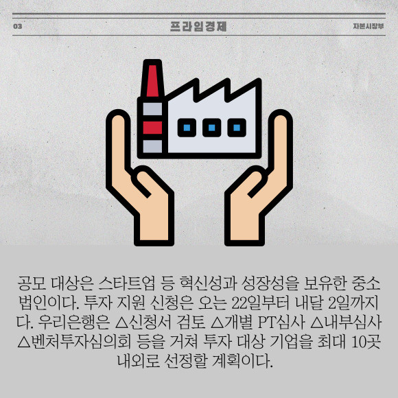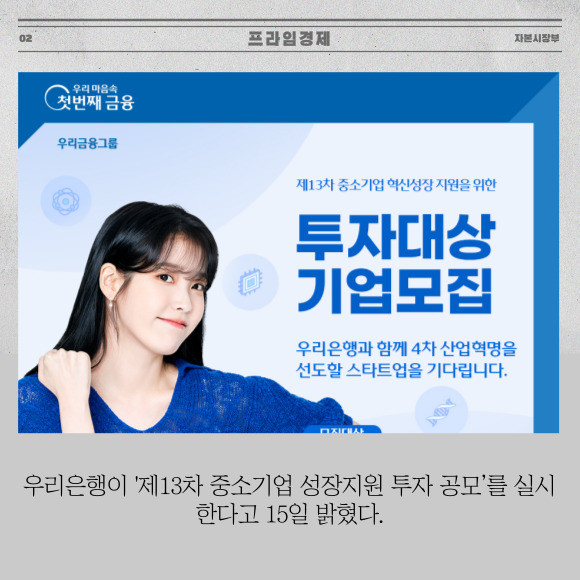 [프라임경제] 우리은행이 '제13차 중소기업 성장지원 투자 공모’를 실시한다고 15일 밝혔다.
