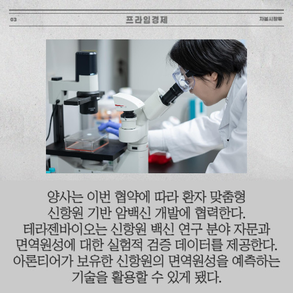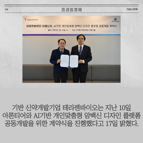 [프라임경제] 기반 신약개발기업 테라젠바이오는 지난 10일 아론티어와 AI기반 개인맞춤형 암백신 디자인 플랫폼 공동개발을 위한 계약식을 진행했다고 17일 밝혔다.