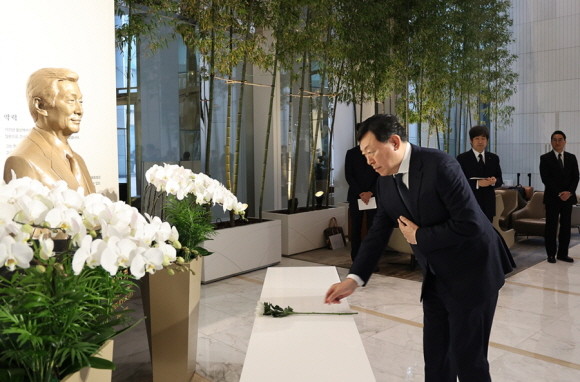 18일 오전 서울 송파구 롯데월드타워 1층에서 열린 신격호 롯데 창업주 4주기 헌화식에서 신동빈 롯데 회장이 헌화하고 있다. © 롯데지주