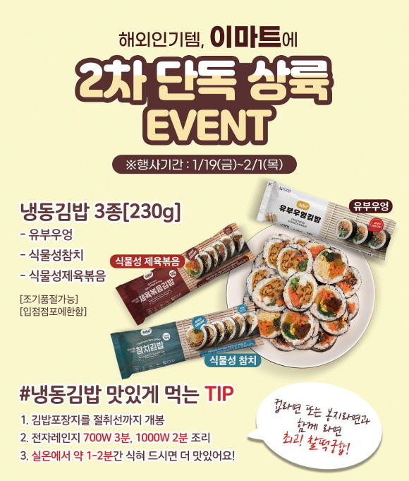 이마트는 1월19일부터 2월1일까지 2주일간 냉동김밥 3종 행사를 진행한다. 이번 행사는 유부우엉김밥 뿐 아니라, 식물성 참치 김밥, 식물성 제육볶음 김밥까지 김밥 종류를 총 3종으로 확대했다.