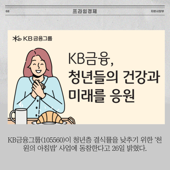 [프라임경제] KB금융그룹(105560)이 청년층 결식률을 낮추기 위한 '천원의 아침밥' 사업에 동참한다고 26일 밝혔다.