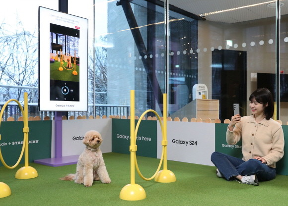 대표적인 공간은 '어질리티&트랙존'이다. 반려동물과 고객이 활동적인 체험이 가능하도록 1층 공간의 절반 이상을 할애했다. 이곳에서는 반려동물과 고객이 설치된 구조물을 뛰어넘는 활동적인 체험이 가능하다. 설치된 '갤럭시S24'를 통해 이 같은 활동을 촬영하고 감상할 수 있다.