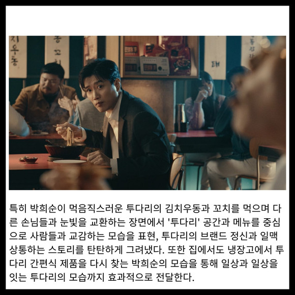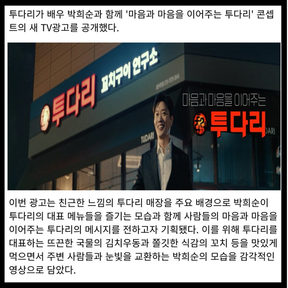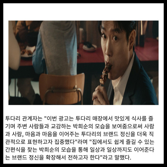 [프라임경제] 투다리가 배우 박희순과 함께 '마음과 마음을 이어주는 투다리' 콘셉트의 새 TV광고를 공개했다.