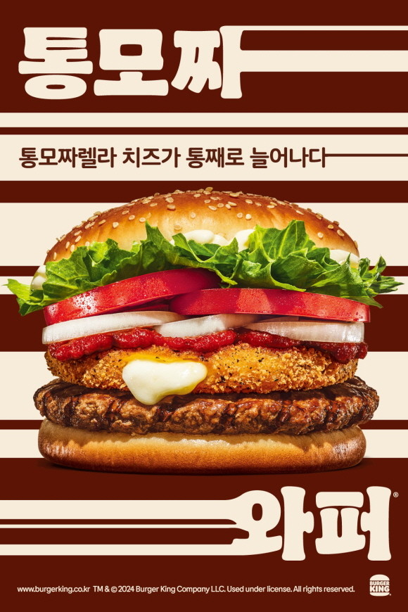 새롭게 돌아온 '통모짜와퍼'는 직화로 구운 100% 순 쇠고기 패티에 두툼한 통모짜렐라 치즈 패티를 올려 더욱 풍성해진 풍미가 특징이다. 쭉 길게 늘어나는 치즈 패티가 고소한 맛은 물론, 압도적인 비주얼을 완성한다.