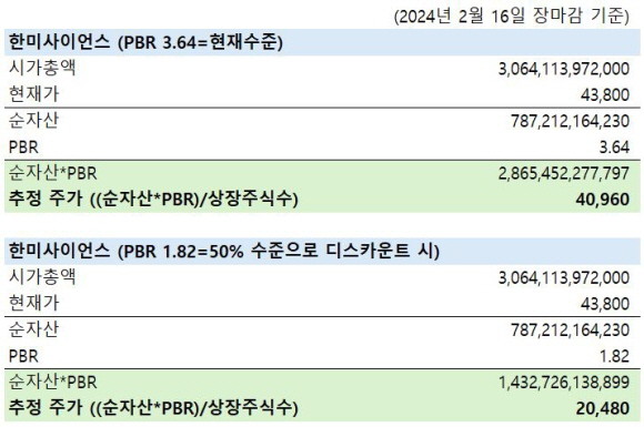 또한 "한미사이언스의 경우 지주회사임에도 불구하고 PBR이 2024년 2월16일 기준 3.64배로 KRX에 기재된 코스피 헬스케어 기업들의 평균인 3.55배 보다도 높은 수치를 기록하고 있다. 반면, 국내의 주요 중간지주회사들의 경우 지주회사 디스카운트 요인으로 인해 PBR이 매우 낮은 수준이며 대부분 1배수 이하로 저평가 받고 있다"고 덧붙였다.