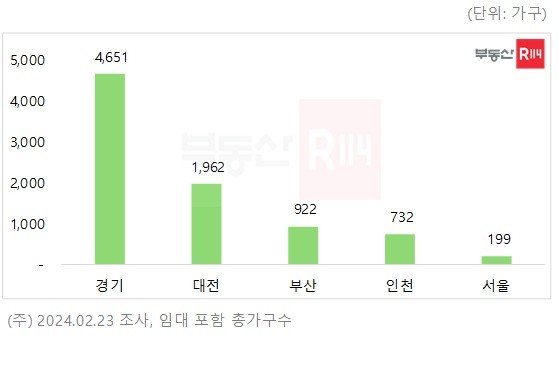 시도별 분양예정 물량은 △경기 4651가구 △대전 1962가구 △부산 922가구 △인천 732가구 △서울 199가구 순이며, 이외 지역 물량이 전무하다.