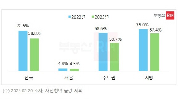 부동산R114가 최근 2년 전국 아파트 일반분양(사전청약 제외) 물량 중 6억원 전용 85㎡이하 가구 비중을 살펴본 결과, 2022년 72.5%(22만487가구 중 15만9801가구)에서 2023년 58.8%(13만4387가구 중 7만9084가구)로 13.7%p 줄었다.