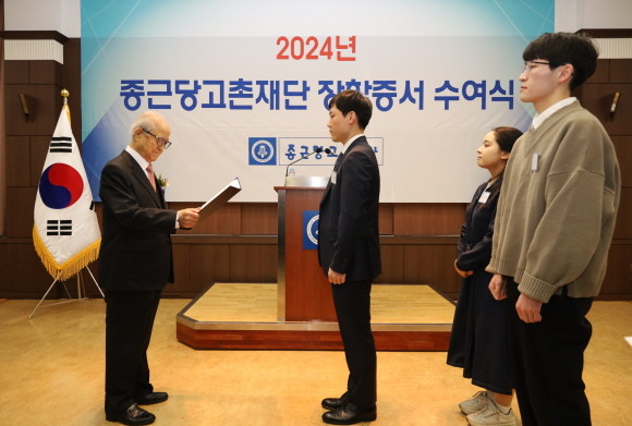 종근당고촌재단은 23일 서울 충정로 종근당 본사에서 '2024년도 장학증서 수여식'을 가졌다. 종근당고촌재단은 올해 신규로 선발된 113명을 포함한장학생 453명에게 졸업 때까지 장학금 및 무상기숙사를 지원한다.