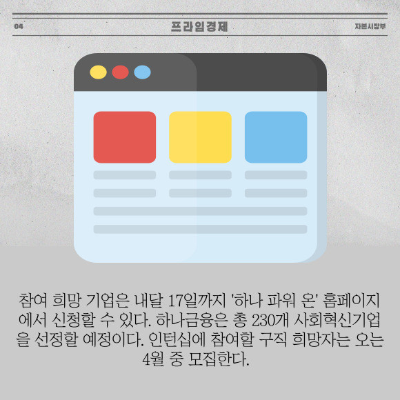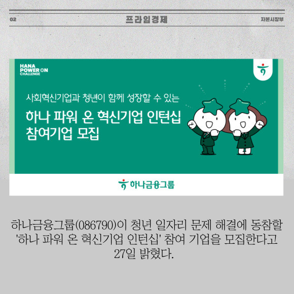 [프라임경제] 하나금융그룹(086790)이 청년 일자리 문제 해결에 동참할 '하나 파워 온 혁신기업 인턴십' 참여 기업을 모집한다고 27일 밝혔다.