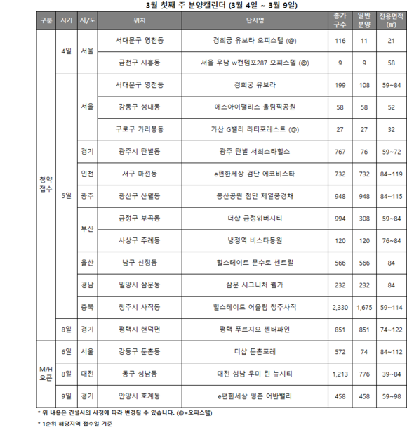 부동산 전문 리서치업체 리얼투데이에 따르면, 3월 첫째 주에는 전국 14곳에서 총 5721가구(오피스텔 포함‧행복주택 제외)가 청약 접수를 받는다.
