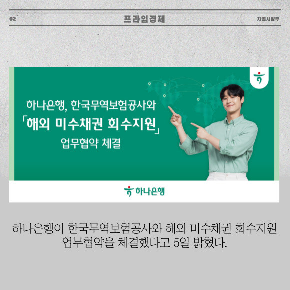 [프라임경제] 하나은행이 한국무역보험공사와 해외 미수채권 회수지원 업무협약을 체결했다고 5일 밝혔다.