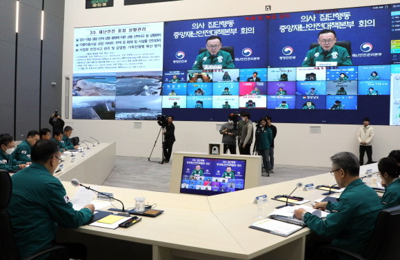 이한경 중앙재난안전대책본부 제2총괄조정관이 5일 오전 정부세종청사 상황실에서 의사 집단행동 중앙재난안전대책본부 9차 회의를 주재하고 있다. © 연합뉴스
