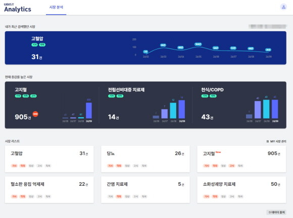 세부적으로 △내가 최근 검색했던 시장 △현재 증가율이 높은 시장 △ 시장 리스트 등 경쟁 시장 전체를 한눈에 조망하는 것은 물론 소송 판결, 특허 이슈 등 시장 별 이슈 9가지와 인허가, 급여 중지 등 약품 별 이슈 13가지 등 세분화된 분석이 가능하다.