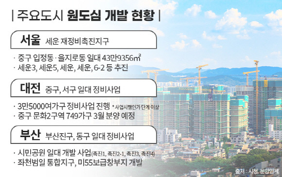 부동산 업계에 따르면 △대전 △부산 △서울 등 대도시 원도심에서 대형 개발 사업이 속속 진행되고 있다.