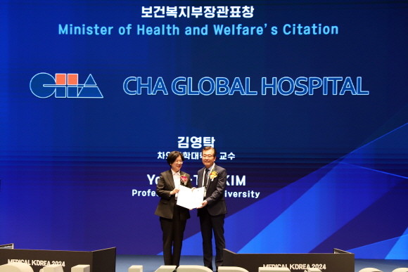 차병원은 김영탁 차 국제병원장이 지난 14일 서울 코엑스에서 열린 '2024 메디컬코리아 글로벌 헬스케어 유공 포상' 시상식에서 보건복지부 장관 표창을 수상했다고 밝혔다.
