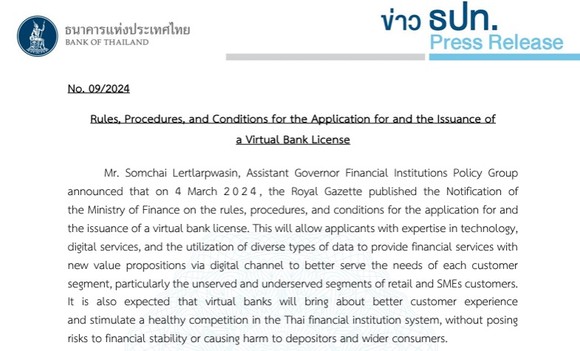 태국 중앙은행은 "가상은행 신청자의 자격과 잠재력, 노력 등을 고려하겠다"며 "가상은행이 금융소비자에게 더 나은 경험을 제공하고 태국 금융기관 시스템에서 건전한 경쟁을 촉진할 것으로 기대된다"고 입장을 밝혔다.