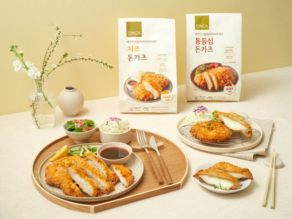 올가 '통등심 돈카츠(420g·140g*3ea)'는 두툼한 국내산 무항생제 통등심 원육을 사용해 풍부한 육즙과 씹는 맛을 살린 것이 특징이다. 특히 우리 쌀이 들어간 습식 빵가루를 사용해 씹었을 때 바삭한 식감과 풍미를 더욱 강조했다. '치즈 돈카츠(420g·140g*3ea)'는 국내산 무항생제 등심에 모짜렐라 치즈를 듬뿍 넣어 쫄깃한 식감과 고소한 풍미를 살렸다.