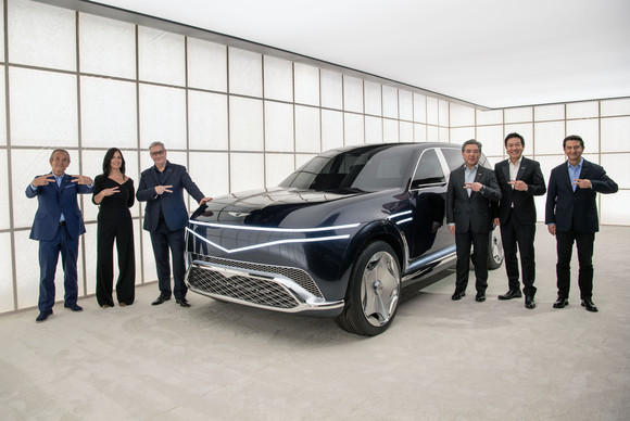 장재훈 현대차 사장을 비롯한 관계자들이 네오룬 콘셉트 앞에서 사진촬영을 하고 있다. ⓒ 제네시스 브랜드