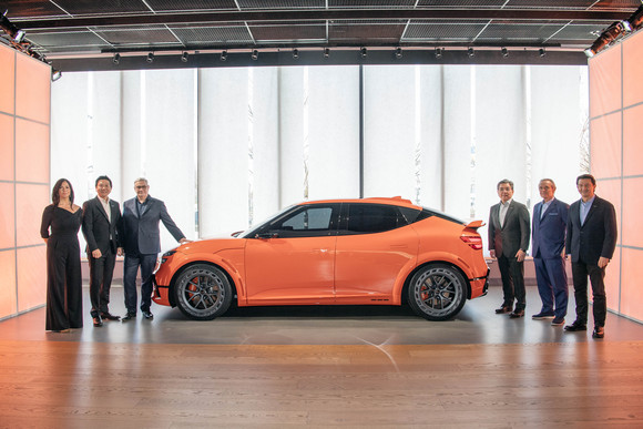 장재훈 현대차 사장을 비롯한 관계자들이 GV60 마그마 콘셉트 앞에서 사진촬영을 하고 있다. ⓒ 제네시스 브랜드