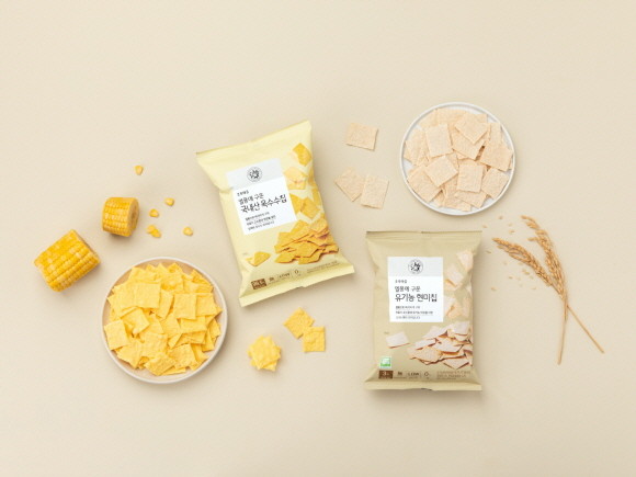 이번 신제품은 세대를 아우르는 전통 곡물 과자 '국내산 옥수수칩'과 '유기농 현미칩' 2종이다. 국내산 옥수수와 유기농 현미를 원재료로 하는 100% 식물성 간식으로, 원물 본연의 맛과 특성을 최대한 구현한 점이 가장 큰 특징이다.