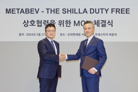 신라면세점은 이달 27일 서울 중구에 위치한 신라면세점 서울점 VIP 프레스티지 라운지에서 김태호 호텔신라 TR부문장과 여인수 메타베브코리아 대표, 이종민 메타베브코리아 부사장 등이 참석한 가운데 신라면세점과 메타베브코리아의 상호협력을 위한 MOU 체결식을 진행했다고 밝혔다.