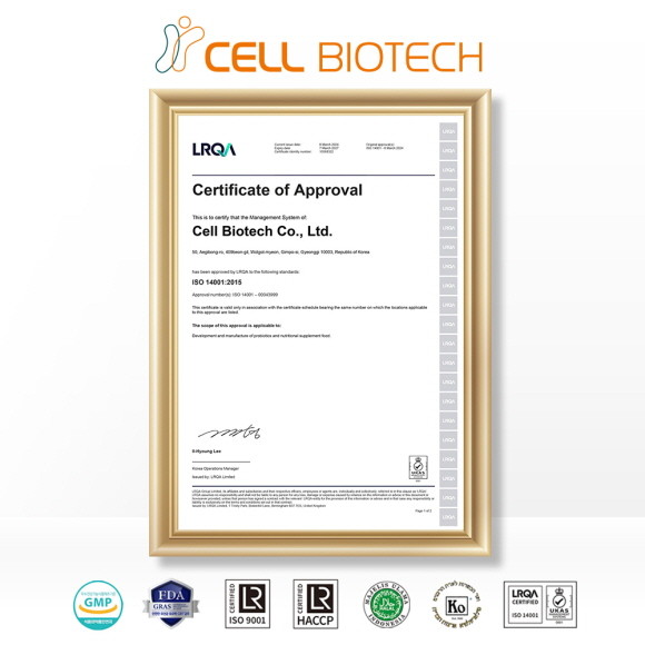이번 ISO 14001 외에도 쎌바이오텍은 다양한 인증 기반의 국제 표준 시스템을 갖추고 있다. 유산균 선진 시장인 유럽식품안전청(EFSA)의 기준으로 제품을 생산하고 있으며, △GMP △ISO 9001 △해썹(HACCP) △할랄(HALAL) △코셔(Kosher) 인증을 획득해 세계 50여 개국에 수출하고 있다. 최근에는 한국산 유산균 11종에 대해 세계 최상위 안전성 인증 제도 美 FDA GRAS를 취득했다. 11종 등재는 단일 기업 중 세계 최다 건수로, 유수의 글로벌 기업을 꺾고 세계 시장에서 K-유산균의 안전성과 우수성을 입증한 국가적 성과로 평가되고 있다.