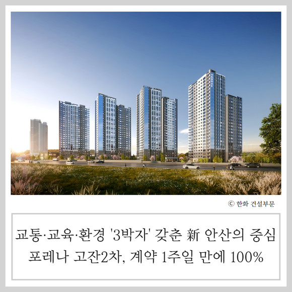 한화 건설부문 관계자는 이번 완판과 관련해 "교통·교육·환경 등 주거 여건과 함께 2021년 분양을 완료한 포레나 안산고잔을 포함해 1000여세대 '포레나 브랜드 타운' 형성이라는 기대감도 작용한 것"이라고 바라봤다.