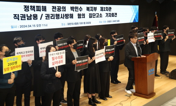 15일 사직 전공의 1360명은 서울 용산구 대한의사협회 회관에서 기자회견을 열고 박 차관을 직권남용 및 권리행사방해 혐의로 고위공직자범죄수사처에 고소한다고 밝혔다. © 연합뉴스