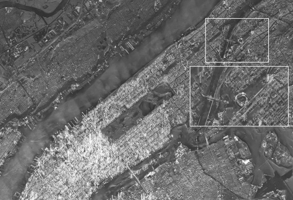 한화시스템 소형 SAR 위성이 촬영한 미국 메이저리그 뉴욕 양키스의 홈구장 '양키 스타디움' 모습. ⓒ 한화시스템
