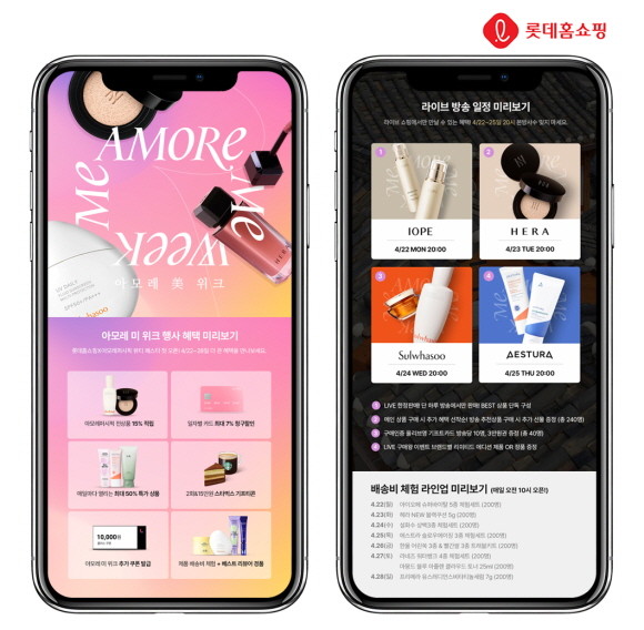 오는 22일부터 28일까지 인터넷 쇼핑몰 롯데아이몰에서 아이오페, 헤라, 설화수 등 아모레퍼시픽대표 브랜드의 인기 상품을 최대 50% 할인하는 '아모레미위크'를 개최한다. 아이오페 '슈퍼바이탈 라인', 설화수 '윤조에센스', 헤라 '블랙쿠션', 한율 '어린쑥 라인' 등브랜드별 대표 상품을 대량으로 준비했다. 구매고객 대상 최대 15% 적립, 7% 카드할인 등 혜택도 제공한다. 또한 25일까지 매일 오후 8시 모바일 TV '엘라이브'에서 뷰티 특집 방송을 진행한다.