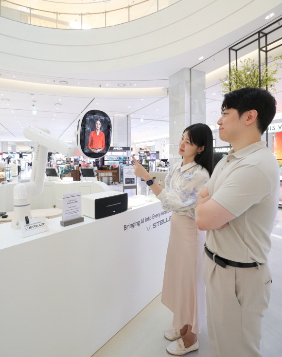 25일 오전, 경기도 성남시 분당구에 위치한 현대백화점 판교점 1층 열린광장에서 고객들이 소통형 AI 로봇 '스텔라V'와 대화를 나누고 있다. © 현대백화점