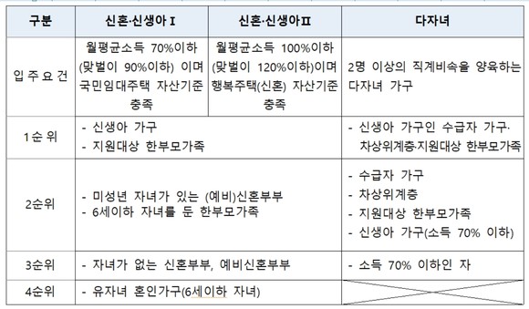 이중 I 유형은 세대 월평균 소득이 전년도 도시근로자 가구원수별 가구당 월평균 소득 70%(맞벌이 90%) 이하이며, 국민임대주택 자산기준을 충족하는 경우 신청할 수 있다. II 유형의 경우 세대 월평균 소득이 100%(맞벌이 120%) 이하로, 행복주택 신혼부부 자산기준을 충족하는 경우 신청 가능하다.