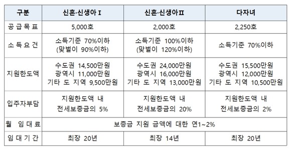 이번 공고는 △신혼‧신생아Ⅰ 5000호 △신혼‧신생아II 2000호 △다자녀 2250호를 모집한다.